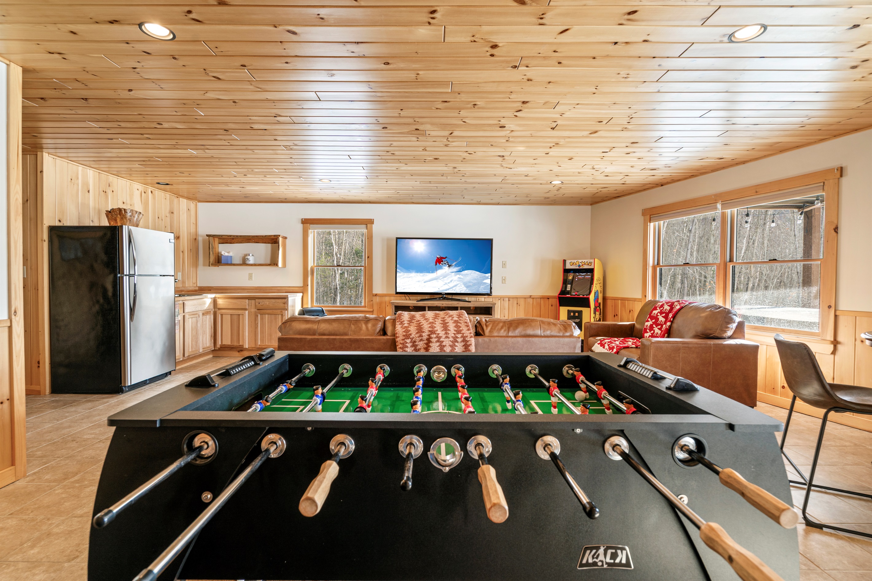 In the basement, next to the living area, you'll find a dedicated video game station perfect for gaming enthusiasts. The bar area or kitchenette, complete with an extra fridge and sink, is ready for your refreshments. And for some added fun, don't forget to enjoy the foosball table to create memorable moments!